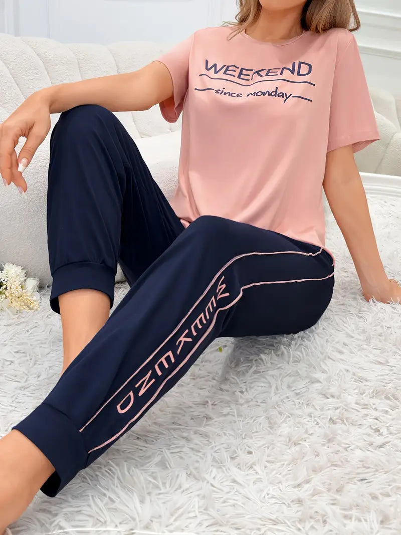 A cute pajama-style set featuring a fun ‘Weekend Since Monday’ print. Lightweight fabric and comfy fit—your new favorite for chill days.